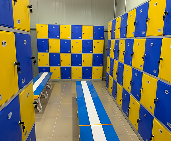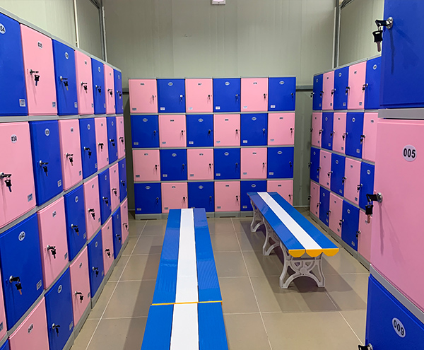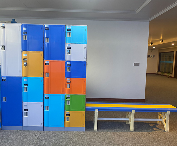 更衣凳面板PVC材質,蹬腿ABS,不使用五金件連接。更衣凳承重大于 500kg,材質厚度 50mm。