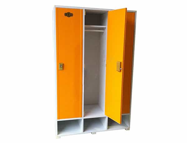 用整塊的塑料中空板材和定制的工程塑料連接件組裝而成。內(nèi)外均為彩色光面,無(wú)五金件,牢固美觀,三門(mén)更衣柜每門(mén)內(nèi)壁配有掛衣桿。